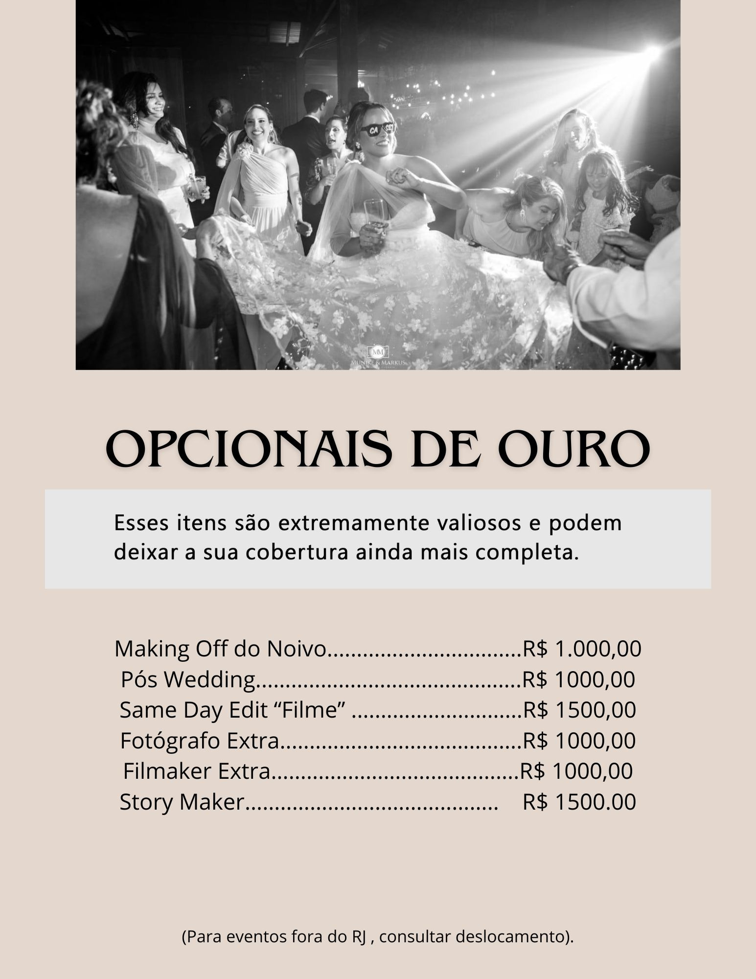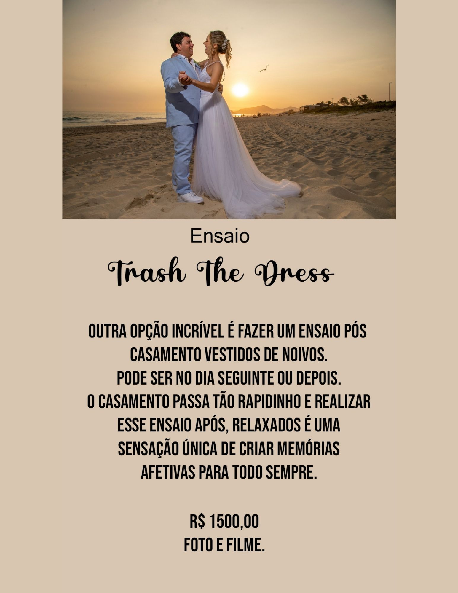 Todas as fotos e filmagem feitas por 2 fotógrafos e 2 cinegrafistas, do making off da noiva, cerimônia e recepção , com aproximadamente 8 horas de cobertura e a entrega feita em mídia digital com no mínimo 700 fotos e mais o ensaio Pré Wedding com fotografia e vídeo com drone e um lindo save the date.